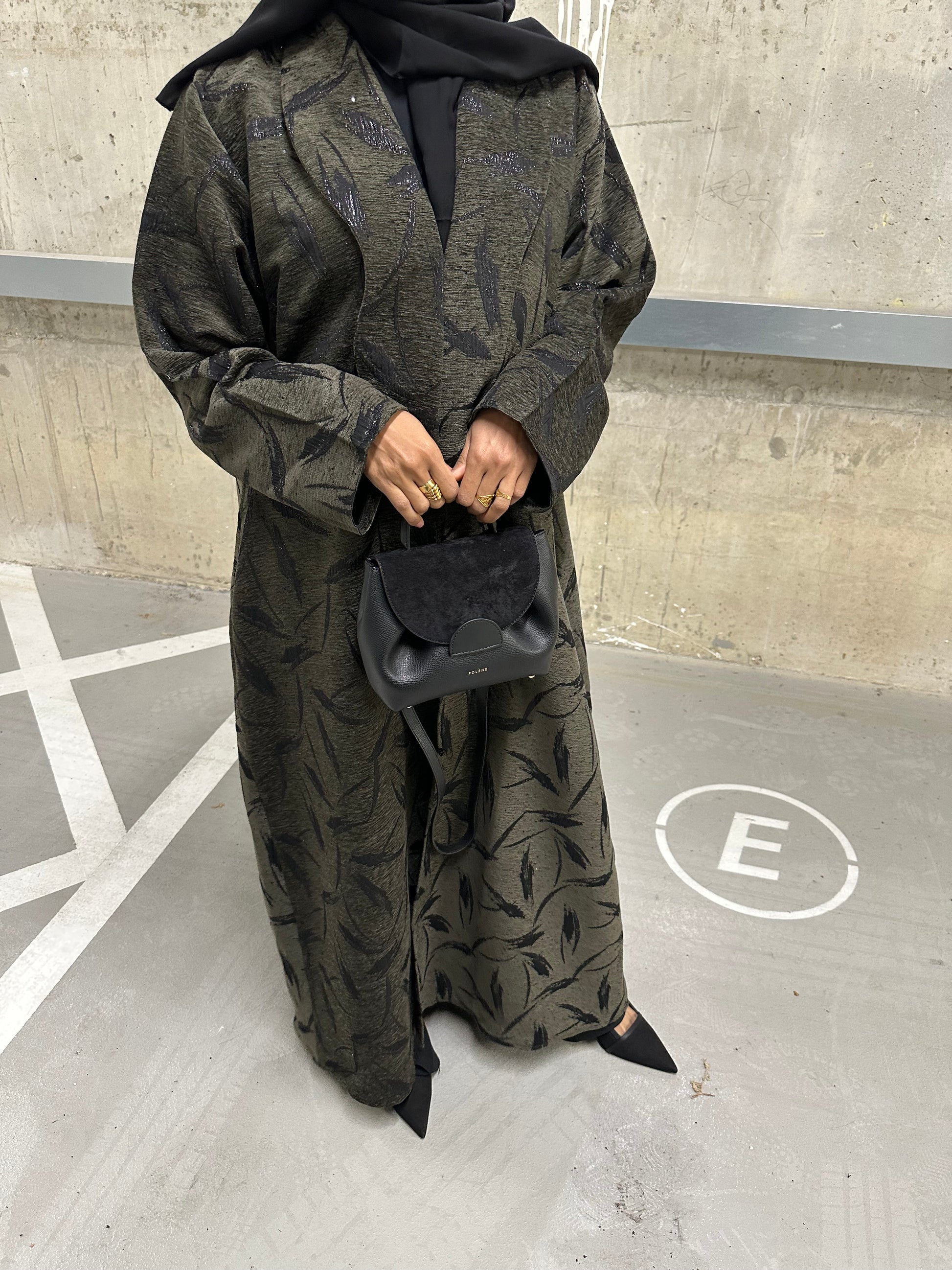This velvet blazer-style abaya features elegant buttons for closure, subtle glitter specks that catch the light, and refined leaf-shaped detailing, creating a sophisticated, radiant look perfect for evening occasions wear.