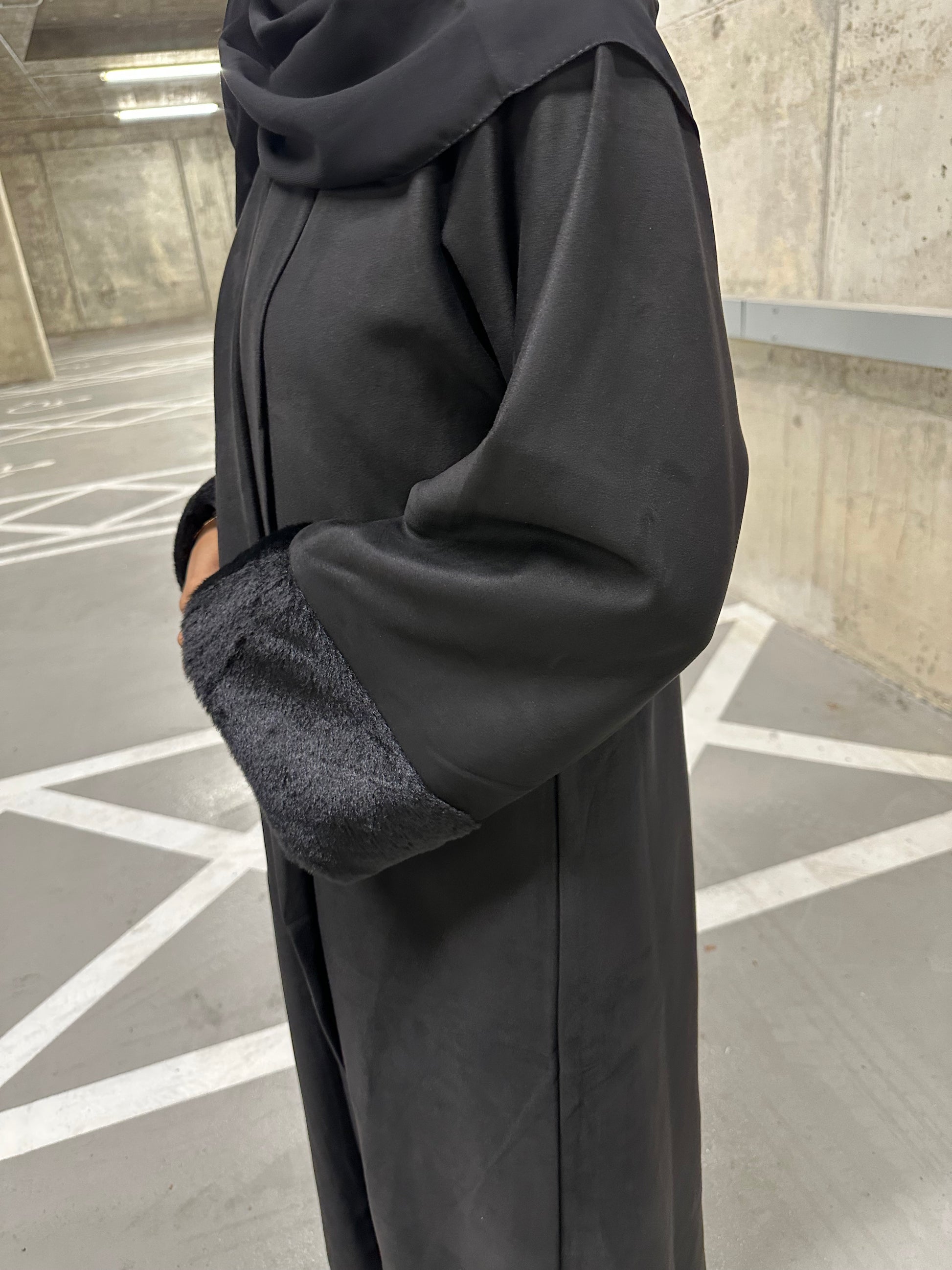 This soft suede dress wraps gracefully with a side tie, featuring plush faux fur at the wrists, an inside tie for adjustable fit and a secure top button closure and a optional belt creating a cozy, elegant, winter-ready silhouette style.
