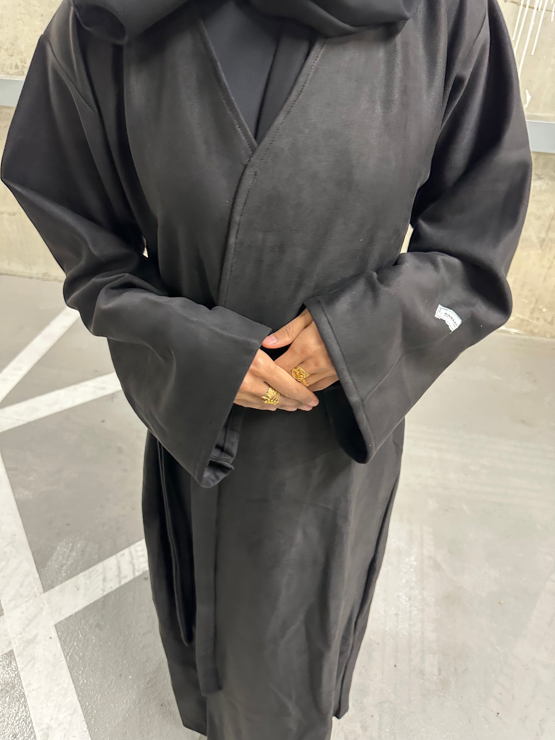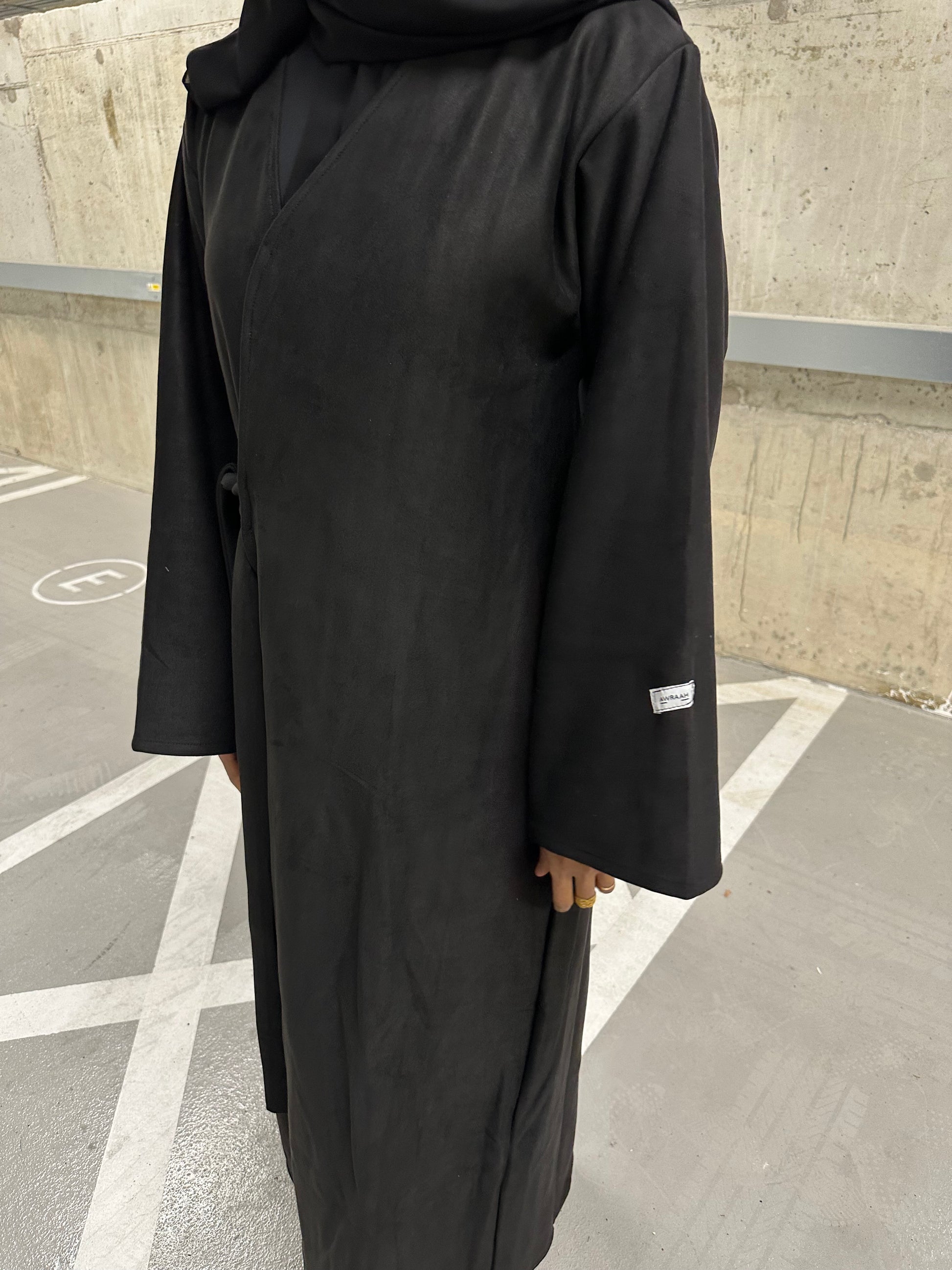 The soft suede abaya drapes smoothly, featuring a graceful side tie that shapes the waist, while a single top button provides a subtle, refined closure for an effortlessly elegant look.