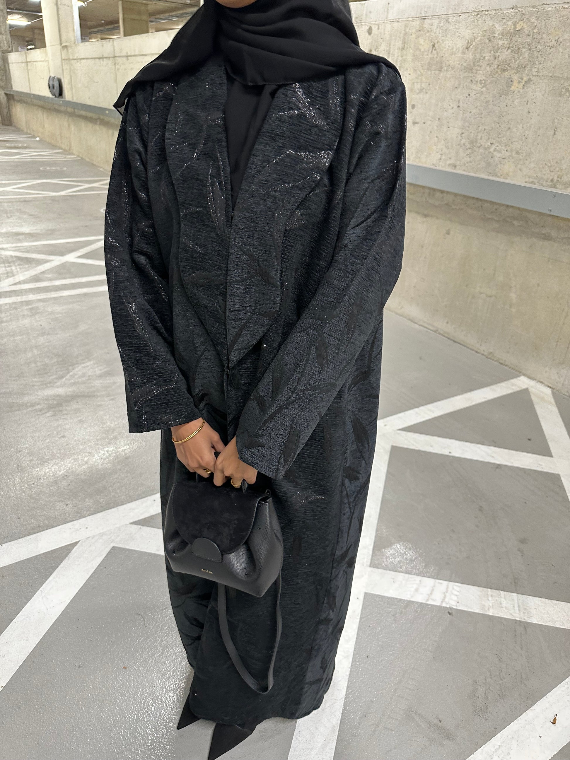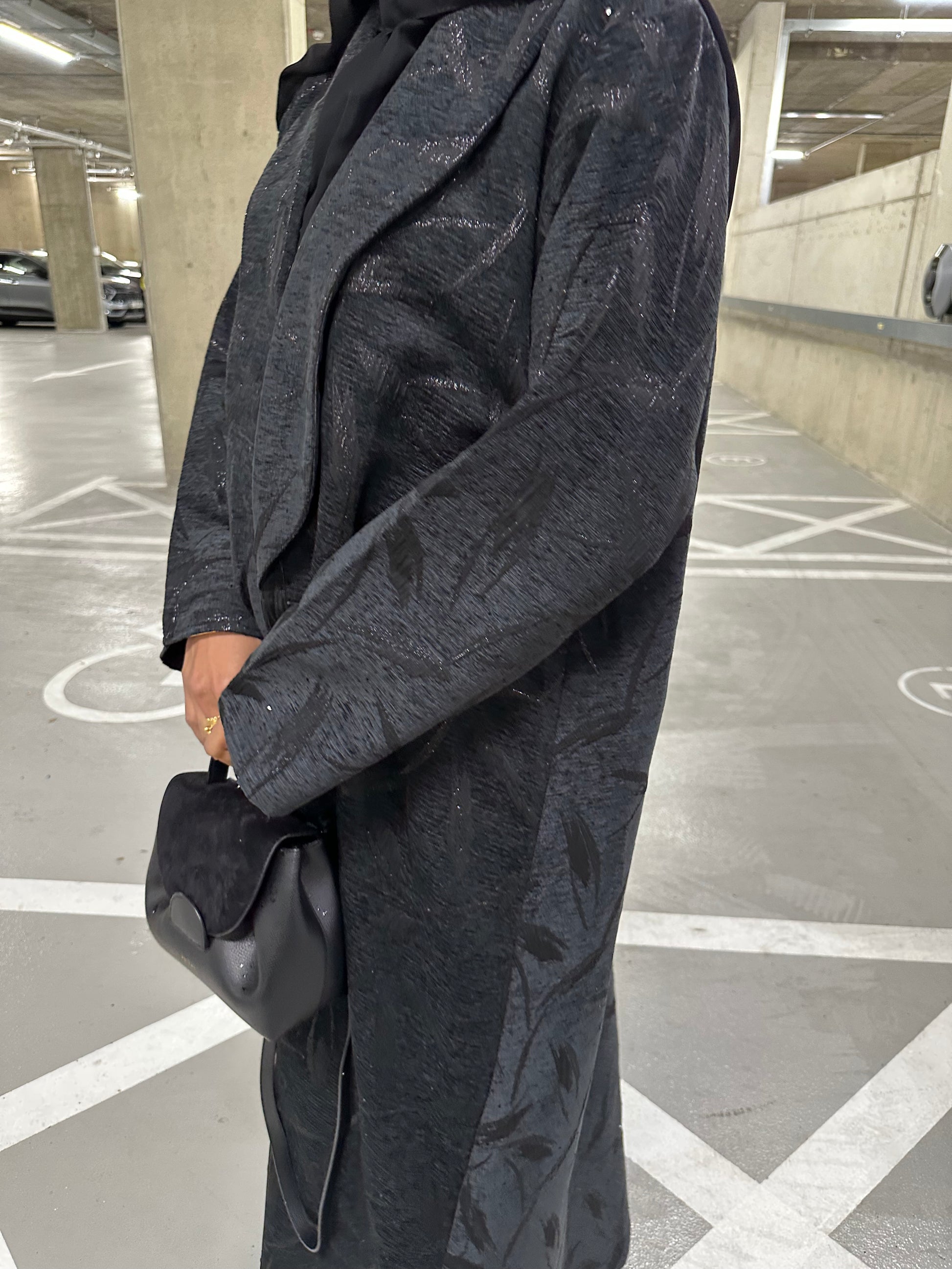 This velvet blazer-style abaya features elegant buttons for closure, subtle glitter specks that catch the light, and refined leaf-shaped detailing, creating a sophisticated, radiant look perfect for evening occasions wear.
